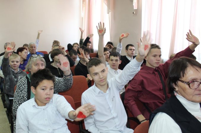 И финальная песня «Дорогою добра», которая завершала выступление, была посвящена именно тем, кто помогает людям от души, у кого большое доброе сердце. Ладошки с нарисованными сердцами, поднятые в зале, показали, что добро объединяет людей.