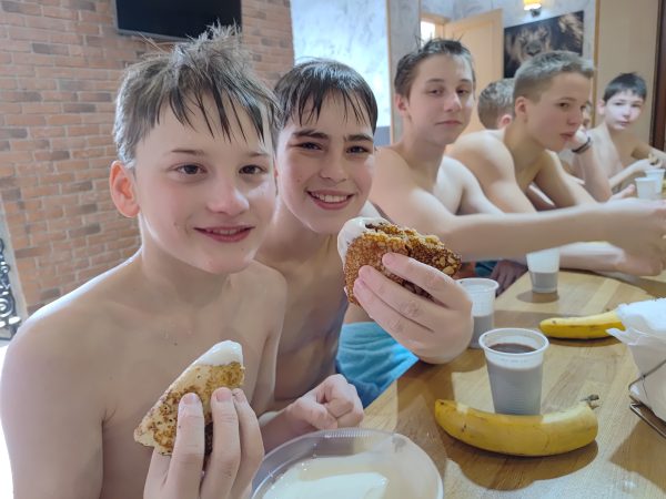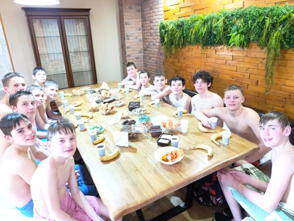…Там я узнал, как правильно париться. Потом мы пошли в бассейн, там мы поигрались, поплавали потом мы пошли в баню, там посидели и побежали в бассейн. Ощущения были изумительные. Потом пошли в хамам, там мы погрелись и опять пошли в бассейн. Проходит некоторое время, мы пошли накрывать на стол, позвали всех кушать. Спасибо нашим спонсорам за то, что сделали такой нам подарок!