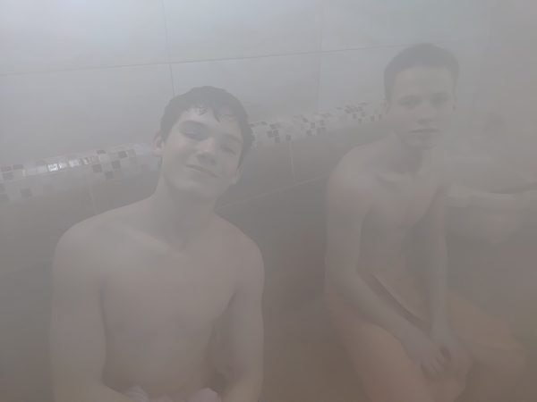 …После душа мы пошли в хамам, посидели, и нас обливали холодной водой. Мне это понравилось. Потом мы пошли, погрелись в сауне, ополоснулись, а потом мы прыгнули бомбочкой в бассейн.