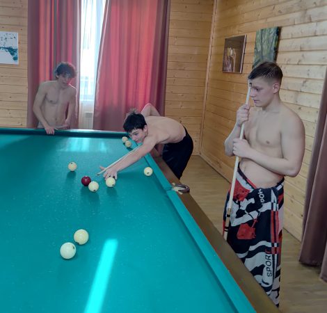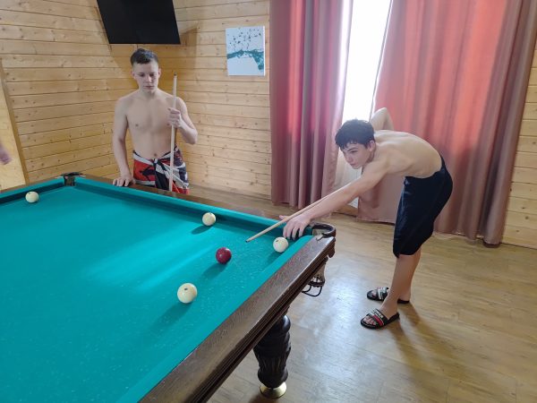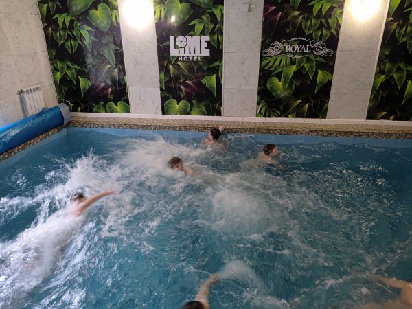 Бассейн был очень бодрым, мы все стали нырять. Потом старшеклассники пошли накрывать, а мы дальше купались. Нравится в бассейне: была классная подсветка и пузыри, а сауна была очень теплая. Потом мы пошли играть в бильярд с киями, было очень интересно.