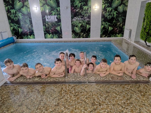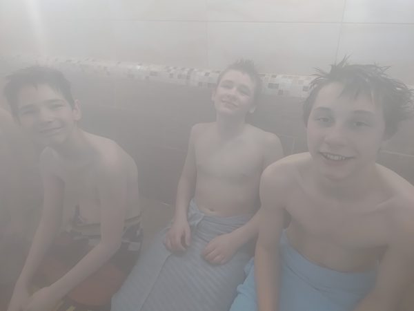 Все переоделись, и мы пошли в хамам. Это комната в густом паре. Когда прогрелись, мы все пошли в бассейн, вода была тёплой и приятной. Ещё мы набирали тазик с холодной водой, и при выходе из хамама обливались до мурашек. Это, правда, кайф и очень приятные ощущения. После мы пошли в сауну. Я в неё зашёл, и бросился приятный запах было очень прикольно. Сауна была очень горячая. После нас ждал ещё сладкий стол, было очень вкусно. Ещё бы раз съездил, мне очень понравилось. Спасибо нашим спонсорам, Александру Геннадьевичу и Алексею Алиевичу, что смогли нам это организовать.