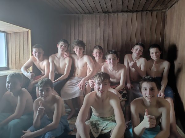 Посидели, нас облили холодной водой – это было очень круто. После этого быстро зашли в сауну, она была уже горячей, мы посидели 10-15 минут, потом пошли пить горячий шоколад. Была красная рыба, блины, зефир в шоколаде, сметана, орехи, палочки в кокосовой стружке, торт был очень вкусный и красивый. Спасибо большое за такую поездку, побольше бы таких поездок!