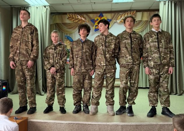Шестиклассники исполнили военную песню, гордо маршируя четко в лад.