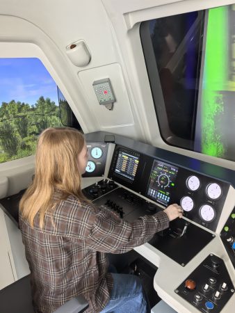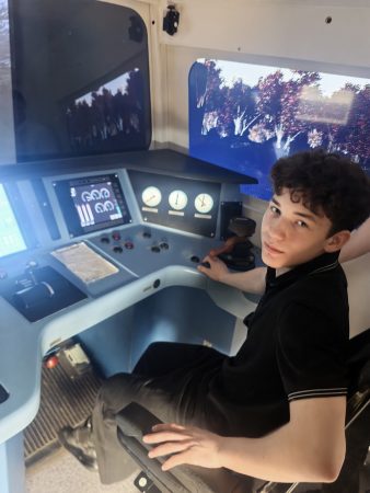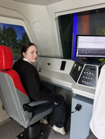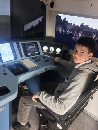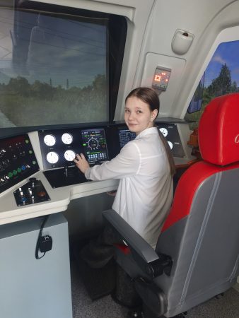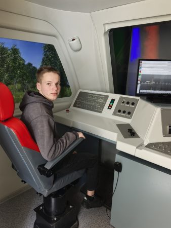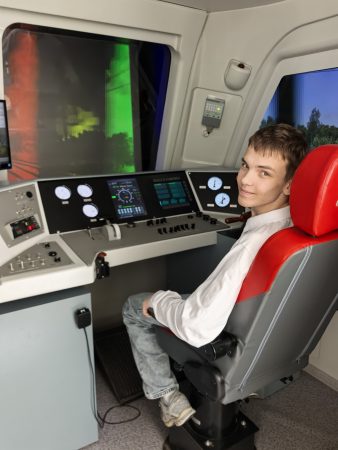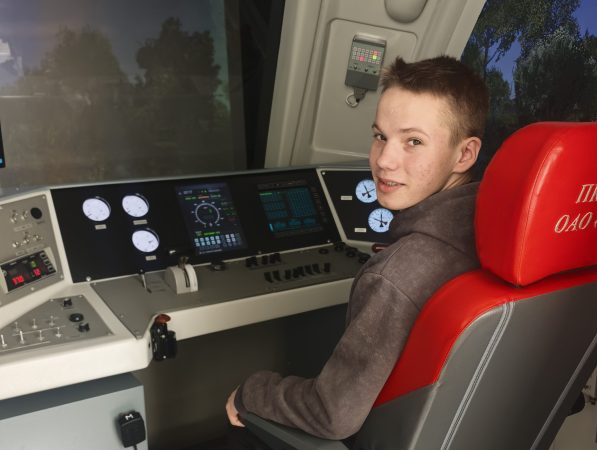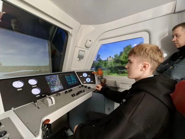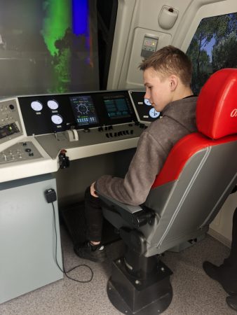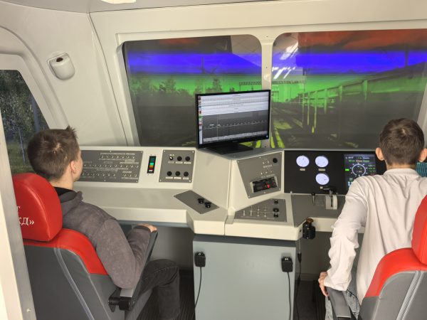 Затем все ребята по очереди побывали в роли машиниста и помощника машиниста на настоящем тренажёре пассажирского и грузового электровоза. Здесь они узнали, как сложно управлять поездом: каждое действие требует времени, особенно когда речь идёт о работе с тормозами.
