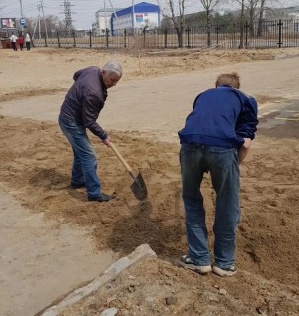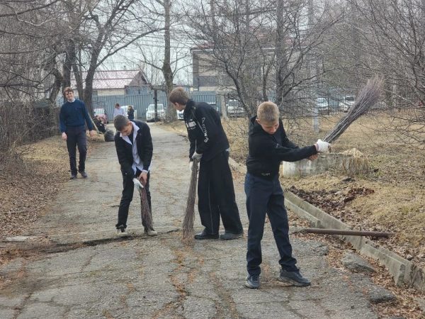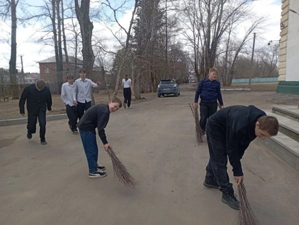 Учителя, воспитатели, мастера производственного обучения вместе с учениками дружно берутся за грабли, метла и другой инвентарь. Вместе приводят в порядок школьный двор.