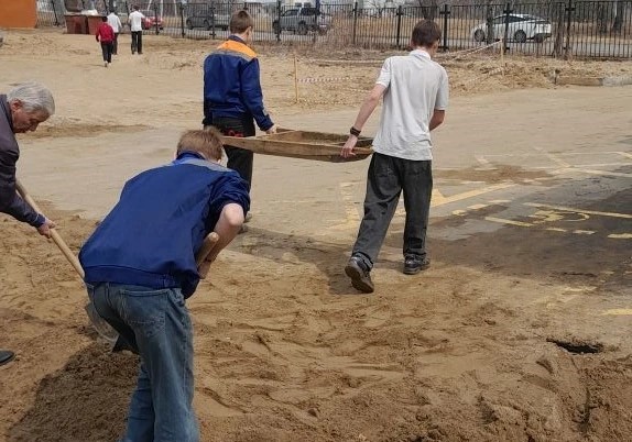 Учащиеся группы «Автодело» убирают с асфальта песок, оставшийся после укладки тепловых сетей.
