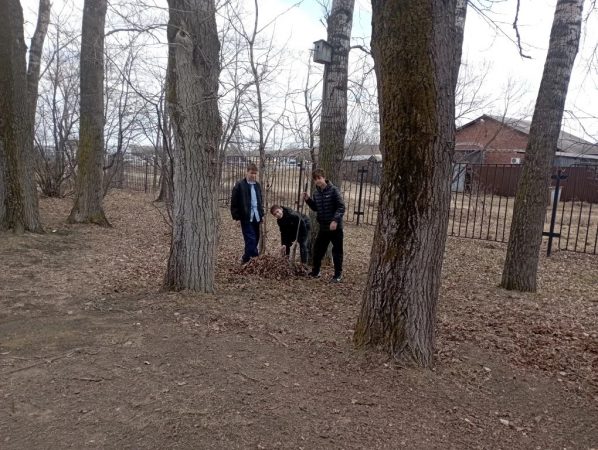 Шестиклассники убирают прошлогоднюю листву в тополиной роще и грушевом саду, скоро он проснется и одарит ароматными цветами пришкольный участок.