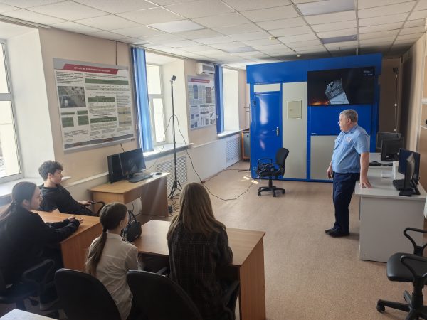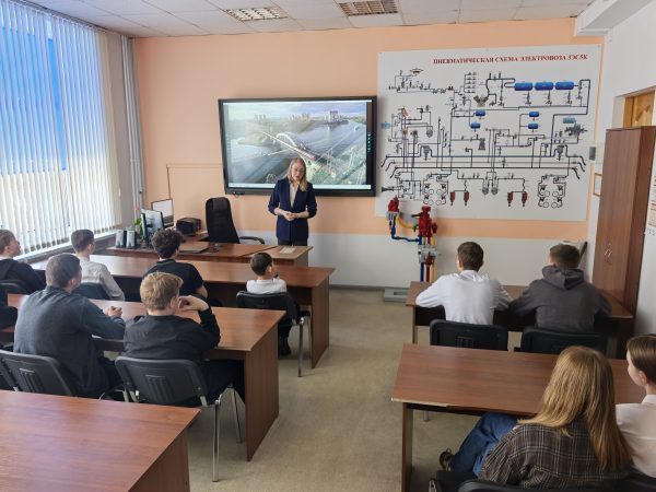 В начале экскурсии ребят пригласили в специализированный кабинет, где изучают устройство и обслуживание тормозных систем подвижного состава. Мария Васильевна, опытный преподаватель, рассказала о компании «Российские железные дороги», о самом учебном центре и о том, какие профессии востребованы на железной дороге.