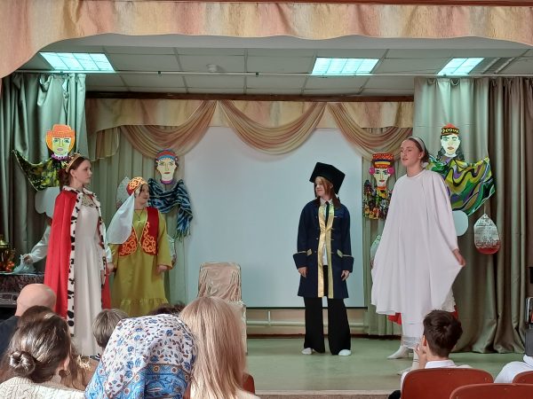 Настал черед учащихся 9А. С воспитателем Ольгой Владимировной Жулиной ребята показали спектакль «Мордовские ремесленники и сладкое золото», показав, чем богата и знаменита мордовская земля и чем славен этот древний народ. Через сказку о смелом охотнике Сураля рассказали о доброте и верности мордовского народа. Его сыграл Лев Щетинин. Уверенно вел свою роль ведущий Максим Армашевский. Ваня Булашенко тоже был молодцом.