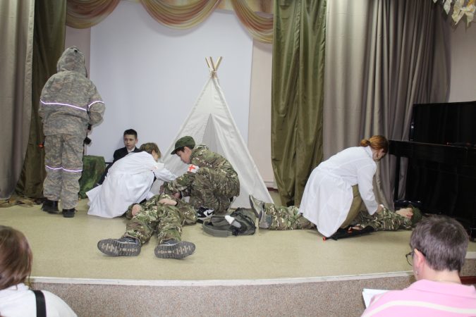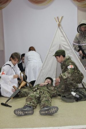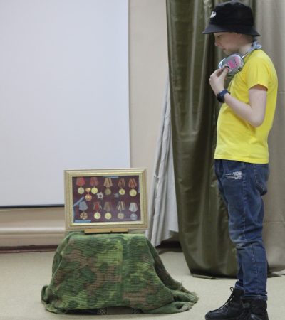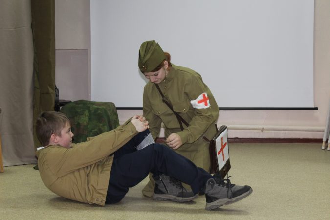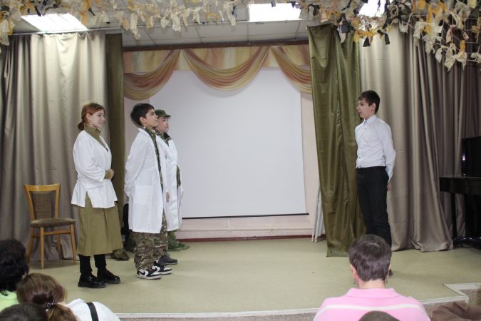 Ученики 7А класса показали постановку о врачах и медсестрах — тех, кто спасает жизни на войне. История соединила прошлое и настоящее. Всё началось с эпизода о Великой Отечественной войне. Ребята разглядывали настоящие боевые медали и слушали рассказ о героине Марии Карповне Байде, которая под огнём вынесла с поля боя раненого бойца. Роль Марии очень проникновенно сыграла Вика Жигалина.