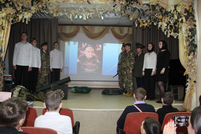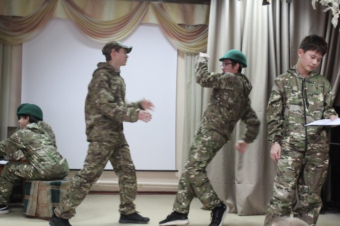 Кульминацией был эффектный танец из фильма про десантников. Мальчики высокие, стройные – очень красиво смотрелись в этом торжествующем танце воинов. Никита Злепков играл Гиви – Михаила Толстых. Он даже немного был похож на настоящего Гиви. Максим Армашевский играл Батю, Дима Овчинников – Базуку. Очень красиво рассказали девятиклассники о легендарных Моторолле (Арсене Павлове) и Гиви (Михаиле Толстых). Их мы никогда не забудем.