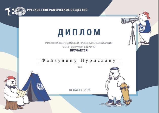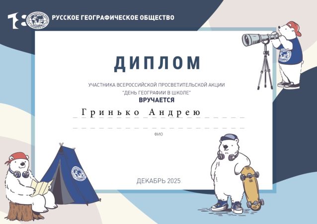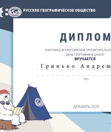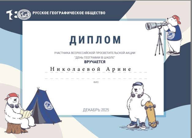 Юные участники «Дня географии в школе» отмечены специальными Дипломами. Лучшие результаты продемонстрировали Файзулин Руслан, Скрипко Георгий, Гринько Андрей, Николаева Арина.