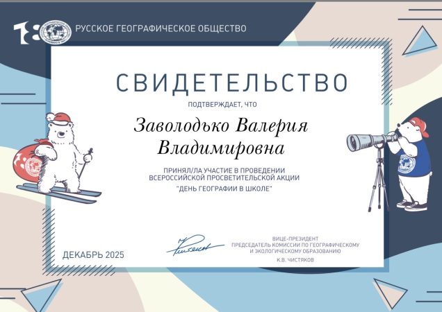С 01 по 14 декабря 2025 г воспитанники Центра приняли участие в новом этапе просветительского проекта Русского географического общества (РГО) «Урок географии в школе». Урок позволил школьникам проверить свои знания и узнать много нового о природе и культуре России. В рамках занимательной викторины учащиеся ответили на вопросы, касающиеся географии и этнографии, народных промыслов, особо охраняемых природных территорий, субъектов Российской Федерации, совершить путешествие по Транссибирской магистрали и часовым поясам. Удивительное животное, с не менее удивительным названием, выхухоль очень понравилось ребятам.