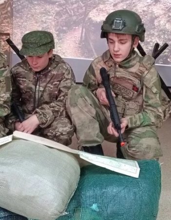 Затем, описывая уже военные события, ребята создали целую баррикаду из мешков и с энтузиазмом стреляли из автоматов.