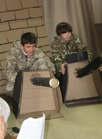 Но живая игра на сцене пока не получалась. Сами дети предлагали, как лучше сыграть тот или иной эпизод. Спасибо мальчикам, они хорошо знали свои роли, четко, уверенно проговаривали их в той последовательности, которая нужна была по сценарию. Выручал Женя Воронюк, который всегда вовремя выходил на сцену и соединял сцены в нужной последовательности. Оставалось увязать их с действиями на сцене. Я благодарна ребятам, которые смогли перестраиваться на ходу, буквально в последние репетиции. Всем отдельное спасибо. Это и слишком высокий для сцены Гриша, которому было поручено выбросить все коробки одновременно, символизируя взрыв, это и медлительный Ярослав, который сам предложить выбросить коробку и с другой стороны. Он придумал сделать кувырок на сцене и изображал наводчика. Это находчивые Вова Быков и Захар Калацук, игравшие бойцов, Ярослав Журавлев, который изображал раненного Полигона, Ярик из 7 класса, заменивший заболевшего Артема. Благодарна людям, которые помогали настроить звуки, музыку и видео чуть ли не в последние мгновения. Это Оксана Валерьевна, Виктория Васильевна, мальчики Дима Овчинников, Лев Щетинин. Спасибо Ольге Викторовне, благодаря которой удалось составить все части пазла воедино, которая живет по принципу: «Никогда не сдавайся!». Результат – аплодисменты благодарных зрителей.