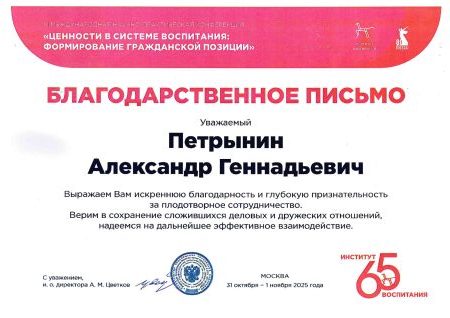 В связи с 65-летием Института изучения детства, семьи и воспитания Александр Геннадьевич вручил памятные медали Центра «Умное, доброе сердце» исполняющему обязанности директора Института воспитания А.М. Цветкову