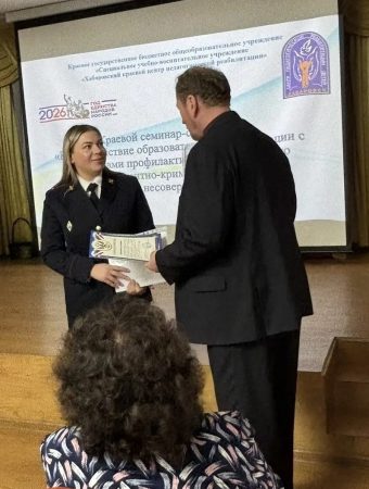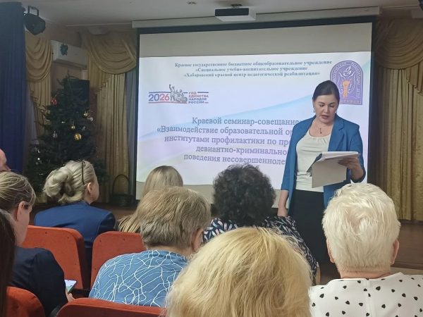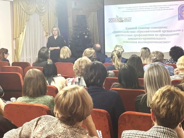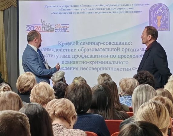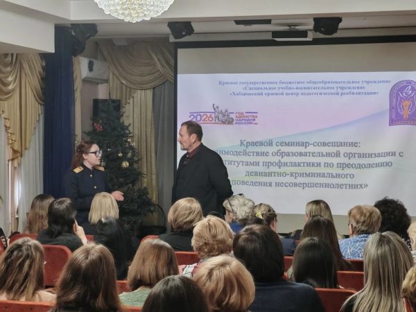 На базе специального учебно-воспитательного учреждения открытого типа «Хабаровский краевой центр педагогической реабилитации» 19 марта 2026 года состоялось ежегодное масштабное событие – краевой семинар-совещание «Взаимодействие образовательной организации с институтами профилактики по преодолению девиантно-криминального поведения несовершеннолетних». Семинар-совещание собрал свыше 100 председателей, заместителей председателя, ответственных секретарей комиссий по делам несовершеннолетних и защите их прав; работников правоохранительных органов; руководителей, заместителей руководителей, педагогов и специалистов образовательных организаций из Бикинского, Ванинского, Верхнебуреинского, Вяземского, имени Лазо, Нанайского, Комсомольского, Хабаровского муниципальных районов края, а также городов Хабаровск, Комсомольск-на-Амуре, Советская Гавань и Вяземский.