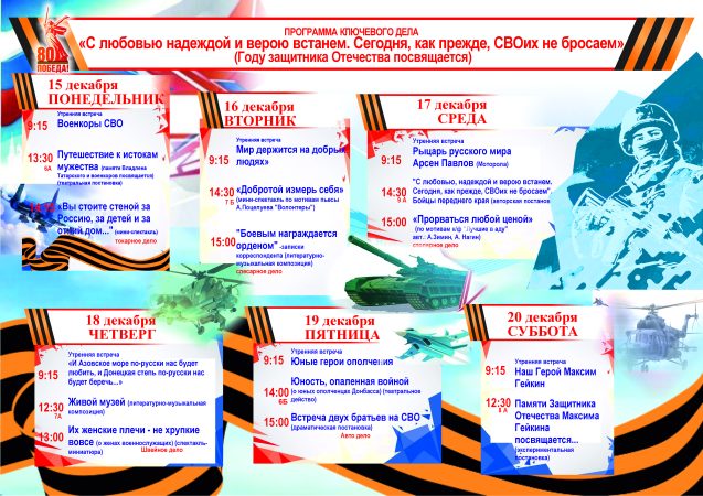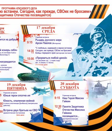 С 15 по 20 декабря ребят и педагогов ждут утренние встречи «Военкоры СВО», «Мир держится на добрых людях», «Рыцарь русского мира Арсен Павлов (Моторола)», «И Азовское море по-русски нас будет любить, и Донецкая степь по-русски нас будет беречь…».