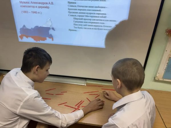 Особое внимание было уделено изучению текста Гимна Российской Федерации и биографии его авторов. Детям были предложены тексты Гимна с пропусками и ребятишки очень быстро восполнили пробелы. Благодаря увлекательным рассказам педагогов ребята смогли лучше понять значимость музыки и слов Гимна для каждой семьи и гражданина России.
