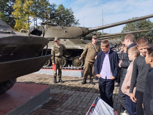 На плацу ребят ждали солдаты, которые несли службу, охраняя боевые машины и выставочные танки.