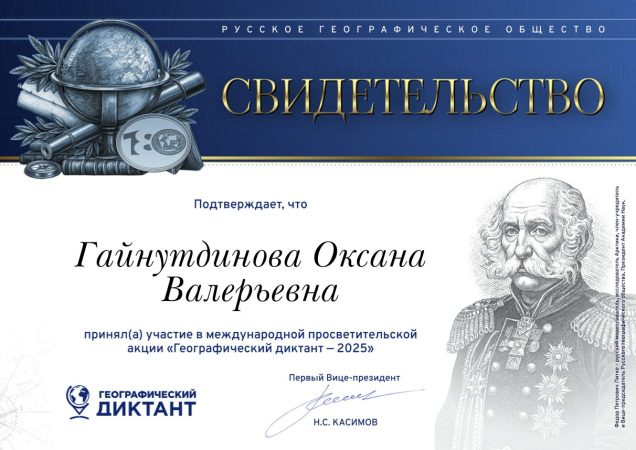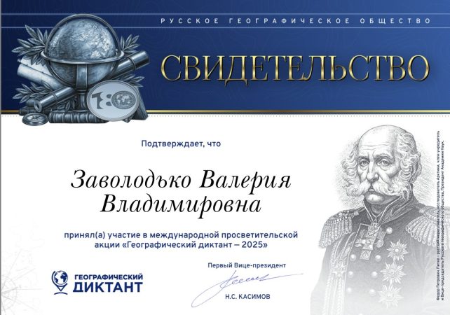 Участие воспитанников и педагогов Центра в проведении международной просветительской акции – «Географическом диктанте» отмечены Свидетельствами, подписанными подписаны академиком РАН, первым Вице-президентом Русского географического общества, известным советским и российским географом, учёным Н.С. Касимовым