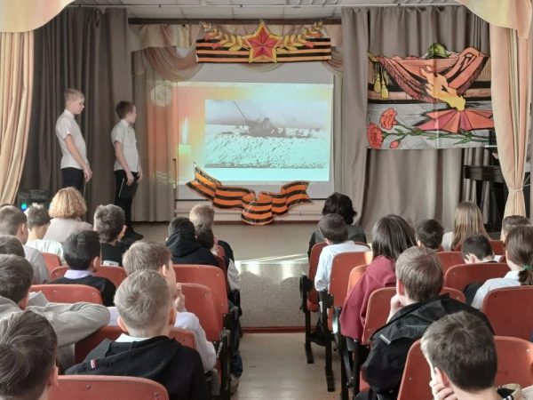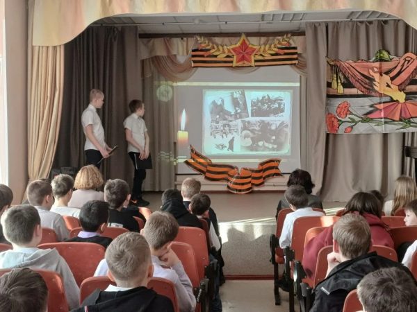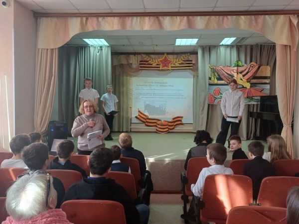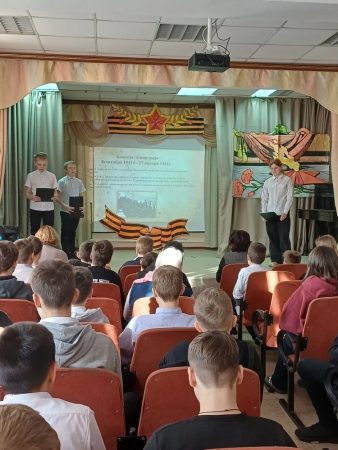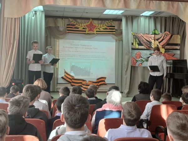 Ведущие, учащиеся 7А класса Матвей Б., Вика Ж. и группы «Столярное дело» Артем Б. на фоне кадров из документальной хроники поведали о детях, переживших страшный голод, холод и постоянные бомбежки, проявивших невероятную выдержку и самоотверженность. Ребята рассказали собравшимся в зале, как учились их сверстники в блокадном Ленинграде: в классах без отопления, писали карандашами на кусочках обоев, шли домой голодные, едва держась на ногах, и помогали старшим поддерживать жизнь в городе. Всё это происходило в условиях нехватки еды, воды и медикаментов.