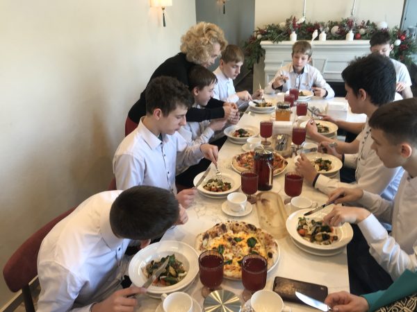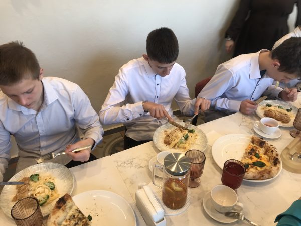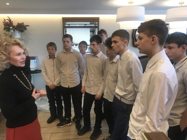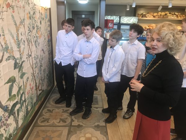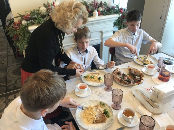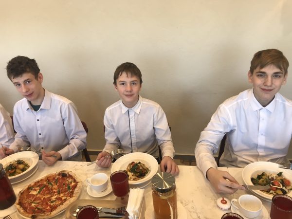 После экскурсии мы сели за стол, нам объяснили правила этикета. Затем нам принесли первое блюдо – салат он с кальмаром, был очень вкусный и необычный. После нам принесли 4 вида пиццы, я успел попробовать все, они были очень вкусные. После пиццы мы отдохнули, попили чай. Было много видов чая. На горячее было куриная отбивная с фитучини. Тоже было очень вкусно. И после всего мы пошли выбирать пирожное, оно как всегда было вкусное. Спасибо Ольге Владимировне, что пригласила нас.
