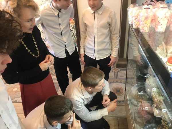 После рассказа мы пошли по цехам, везде зашли, посмотрели. Сначала были на кухне, потом поднялись наверх, там – кондитерский цех. Потом спустилсь в цоколь, где находился склад. Мне было очень интересно и увлекательно. Потом мы пошли завтракать. Сначала нам принесли очень вкусный салат, он мне очень сильно понравился. Поели очень вкусной пиццы.