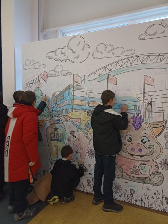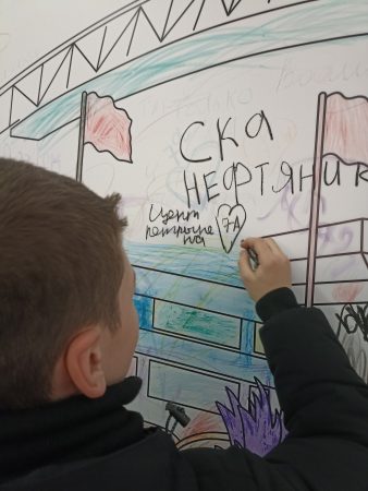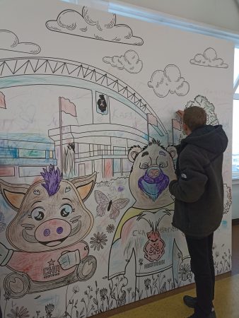 Далее по пути их внимание привлек огромный баннер-раскраска, и тут в каждом проснулся маленький художник. Ребята дружно принялись за раскрашивание, а Вова Д. оставил автограф-приветствие в форме сердечка, упомянув свой класс и место учебы.