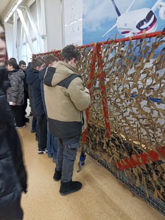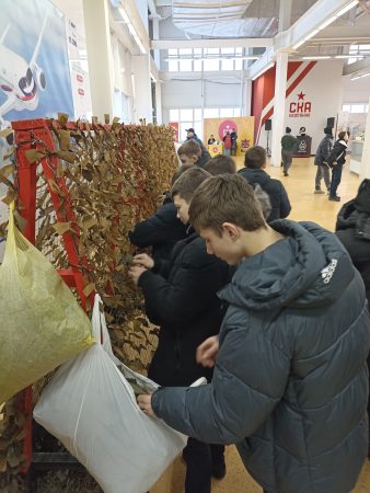 Едва заметив стойку с массетями, ребята тут же выстроились в ряд, демонстрируя слаженность и ловкость. Завязывание узелков – дело им хорошо знакомое, ведь совсем недавно плели сети для наших бойцов, участвующих в СВО.