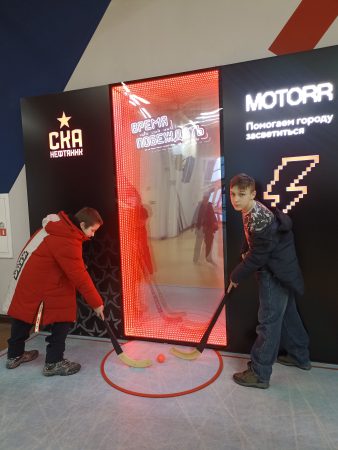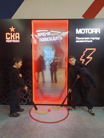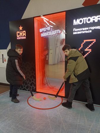Подростки с энтузиазмом исследовали каждый уголок арены, не пропустив ни одной фотозоны. Юра Х. и Семен К. с гордостью примеряли на себя образы настоящих хоккеистов,