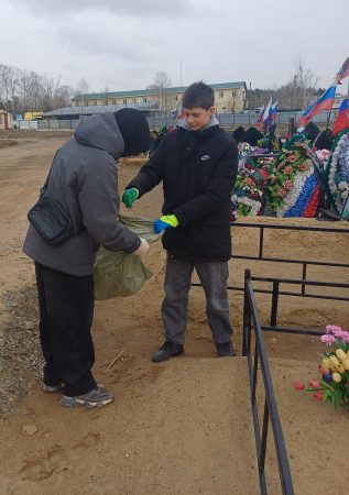 Молодые люди не понаслышке знают, что такое долг и честь. Вооружившись перчатками и мешками для мусора, парни дружно принялись за работу: собирали опавшую листву и ветки, поправляли венки и цветы, ровняли оградки у захоронений.