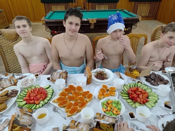 …Я был в бане впервые. Мне очень понравилось париться, меня хорошо хлестали вениками. Ощущение просто супер! После бани мы пили вкусный чай. Угощали вкусняшками, сладостями. Накормили досыта вкусной рыбой и бутербродами с икрой. Спасибо за большое такое мероприятие, нашему директору за организацию и семье Губернатора, что приняли нас у себя!