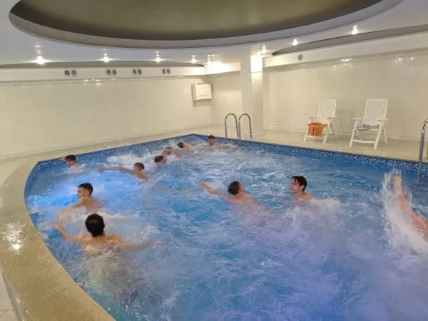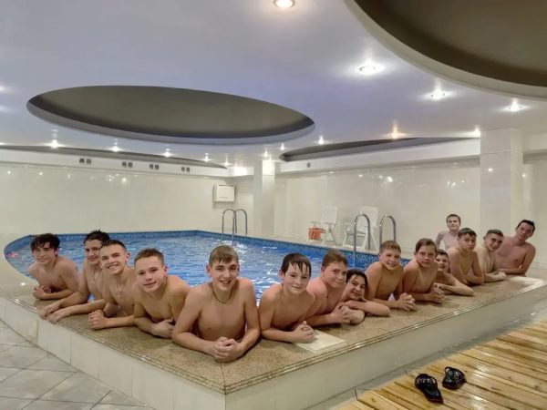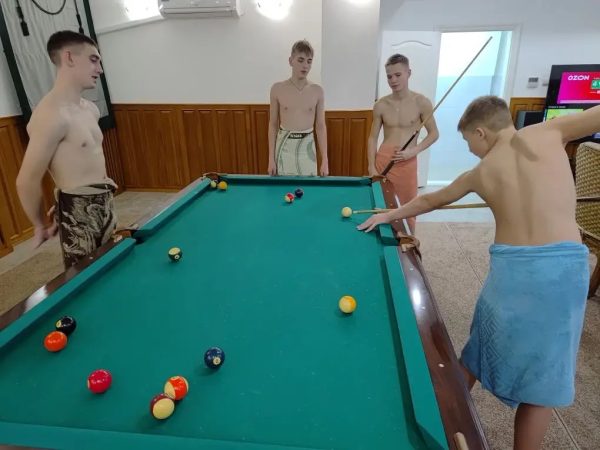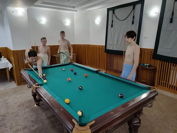 После парилки мы облились холодной водой и пошли в бассейн. Он был теплый и глубокий. В полпятого у нас был полдник, на полднике было 3 разных чая и много сладкого, с нами был друг чемпиона мира по борьбе Виталия Перфильева, мы попили с ним чай, поговорили и пошли с ним в парную. После парной часть детей купались, а часть играла в бильярд, было очень весело и круто.