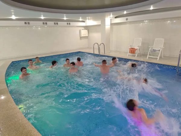 С нами приехали два выпускника Никита и Кирилл, они были за старших. Ощущения в бане очень прикольные, так как ты понимаешь что ты находишься в резиденции. После бани мы сполоснулись и пошли в бассейн – шикарный, большой, да ещё с подсветкой. После некоторого времени мы пошли за стол кушать сладости. Сладости были все разные, и было много, что все наелись.