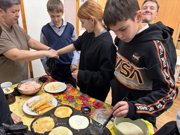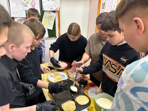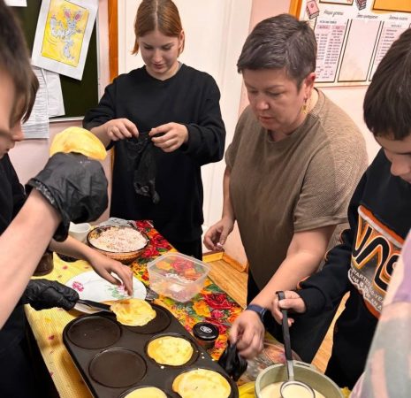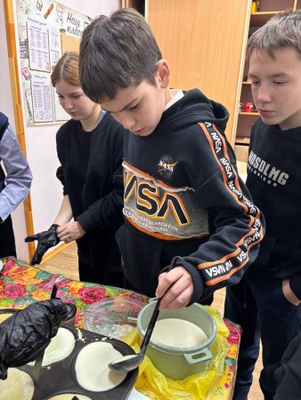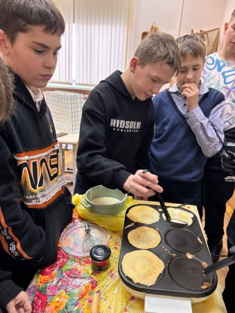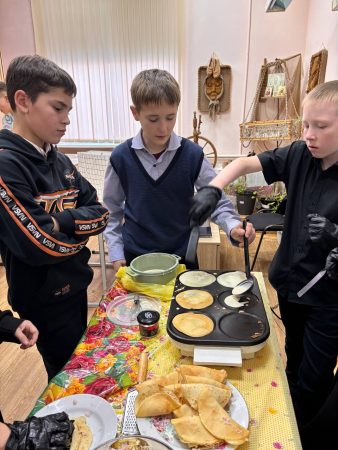 В нашем Центре прошел замечательный мастер-класс для ребят из 7 “А” класса по выпечке ароматных блинов. А к блинам подоспела и начинка, которую юные повара с удовольствием подготовили сами: Гоша С. старательно натирал сыр, а Вика Ж. и Рамиль Г. ловко нарезали ветчину.