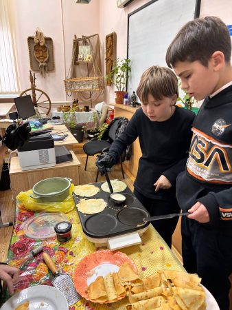 Стопка из готовых сытных блинчиков быстро росла, и вот пришло время снимать пробу. Одноклассники накрыли стол, в середину выставили результат своего поварского искусства, и, пригласив к столу своих наставников, принялись дружно уплетать блинчики собственного производства.