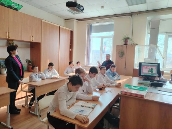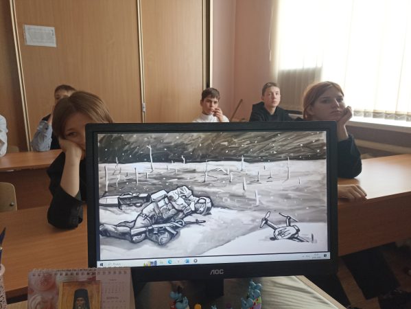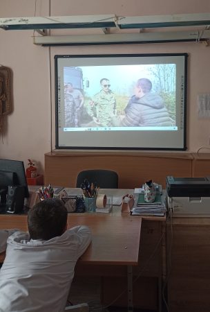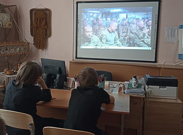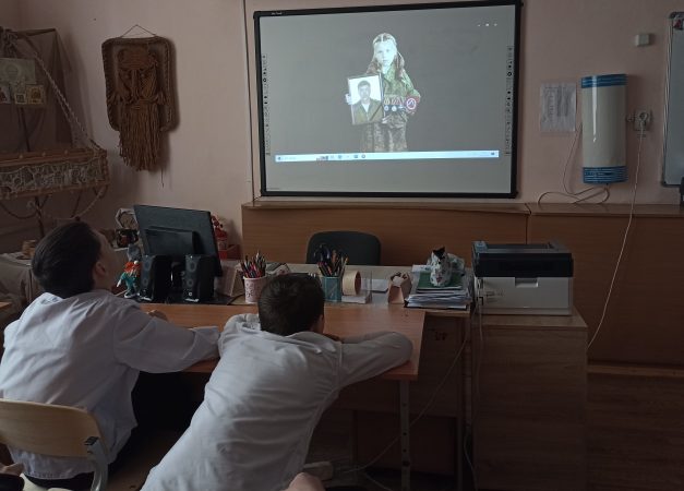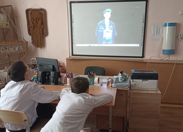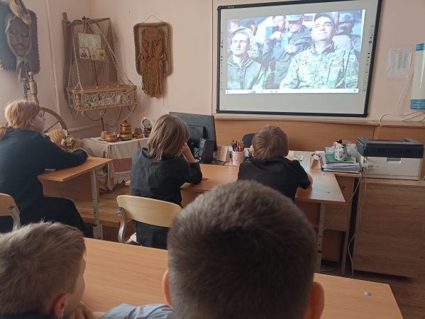В 7 А классе ребятам были показаны видеосюжеты хроники из зоны Специальной военной операции. Прозвучали песни, рожденные в окопах на передовой.