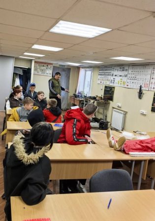 Вторая группа отправилась на экскурсию по учебным классам вместе с Евгением Георгиевичем Размахниным — детским тренером и организатором секции юных автолюбителей. Он подробно объяснил ребятам, какие знания получают ученики автодрома и какими практическими умениями овладевают, как проходят занятия, чем занимаются дети на автодроме. Ребята изучают устройство автомобиля, оказание первой медицинской помощи, и правила дорожного движения. Оказывается, здесь подростки не только изучают теорию, но и практикуются в ремонте автомобилей: учатся протирать клапаны после чего, заливают в них антифриз, и таким образом проверяют, держат клапаны или нет. Младшие паяют детали, старшие чинят двигатели, собирают самостоятельно мопед, а самые увлечённые помогли собирать мотор для катера «Амур»!