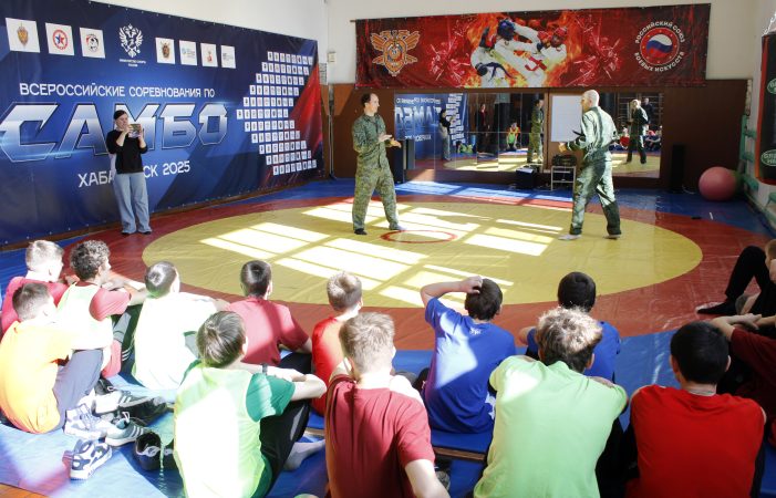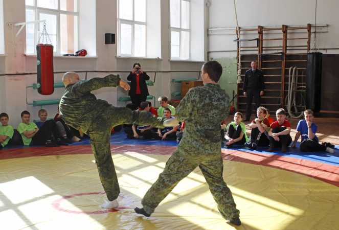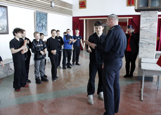 После физических нагрузок для ребят началась самая зрелищная часть. Офицеры продемонстрировали гостям элементы рукопашного боя, а затем показали несколько простых, но эффектных приемов самообороны.
